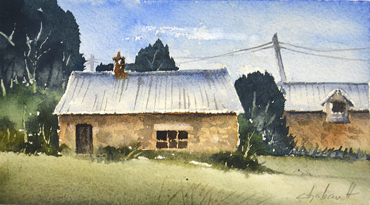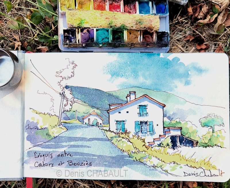 En aquarelle sur le motif, copier fidèlement la réalité n’aide pas toujours. Au contraire, cela peut nuire à la composition. Aujourd’hui, je n’hésite plus à déplacer un buisson, allonger une ombre ou suggérer un chemin qui n’est pas vraiment visible.