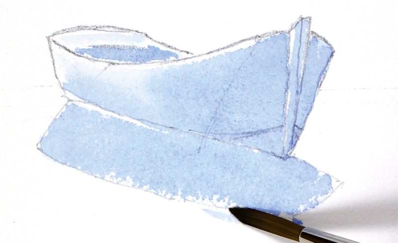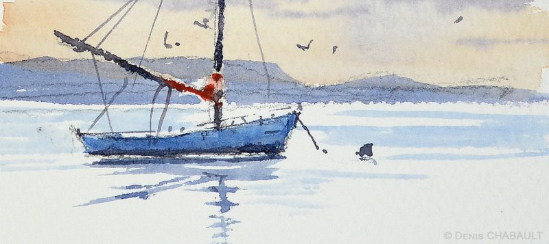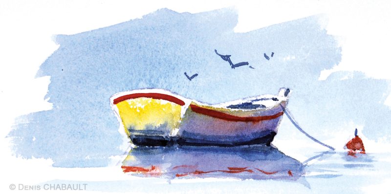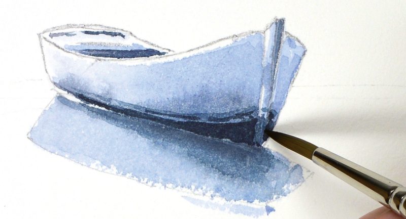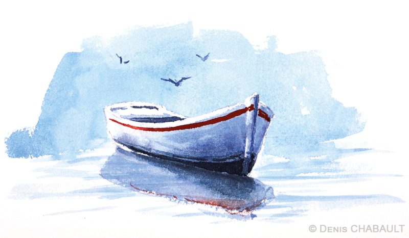 Appliquez un lavis de bleu outremer bien dilué sur la barque.